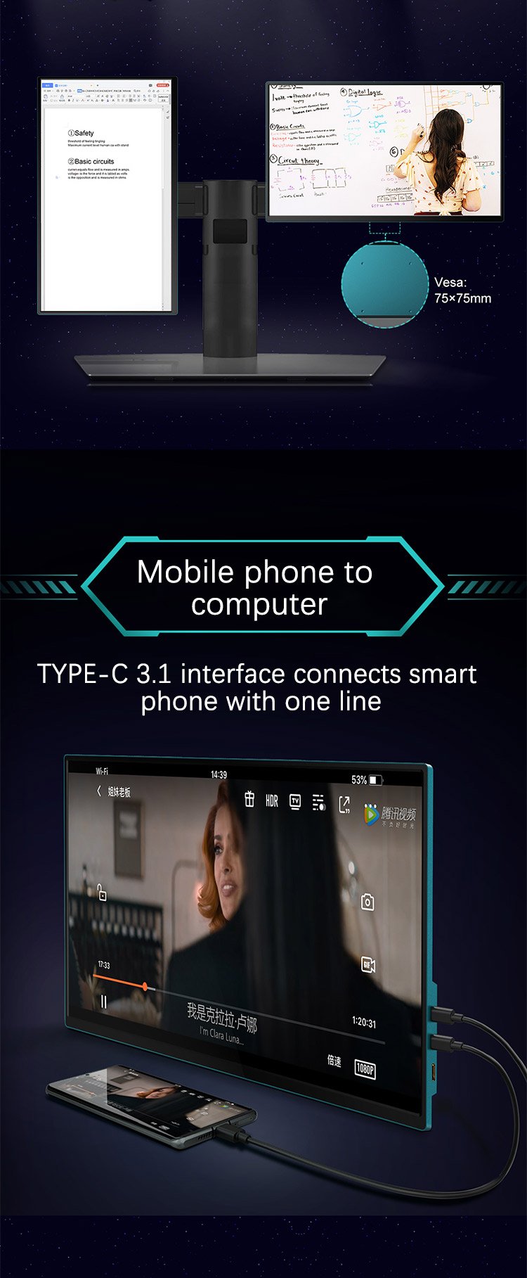| Android phone | Samsung/Huawei/JMGO and other full-featured phones One-line communication: mobile phone mode/PC mode |