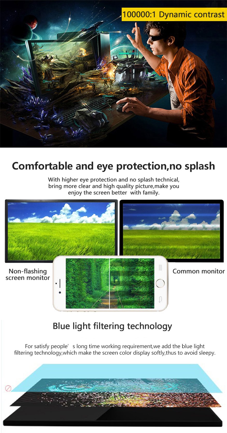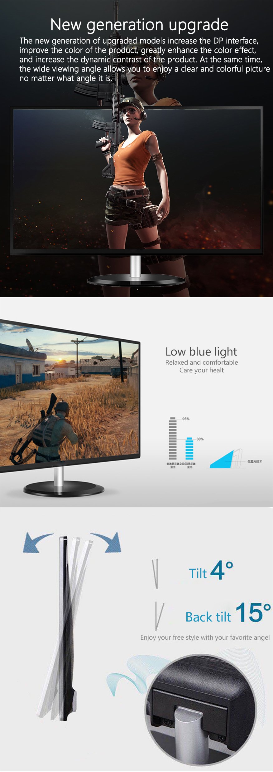 | Gaming Advantange | AMD Free Sync/Low blue light/Ultra vivid/Flicker-free/Cross hair/HDR/Over drive | ||